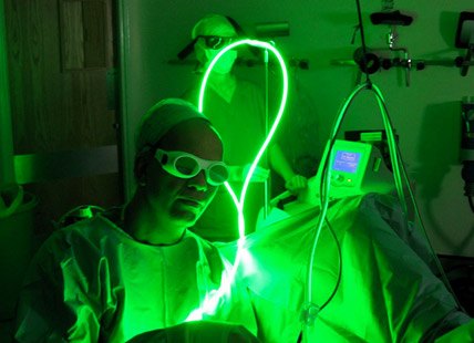 Chirurgul introduce prin uretră un aparat miniaturizat numit rezectoscop prin care se avansează o fibră laser cu ajutorul căreia se poate elibera controlat energie de putere mare.